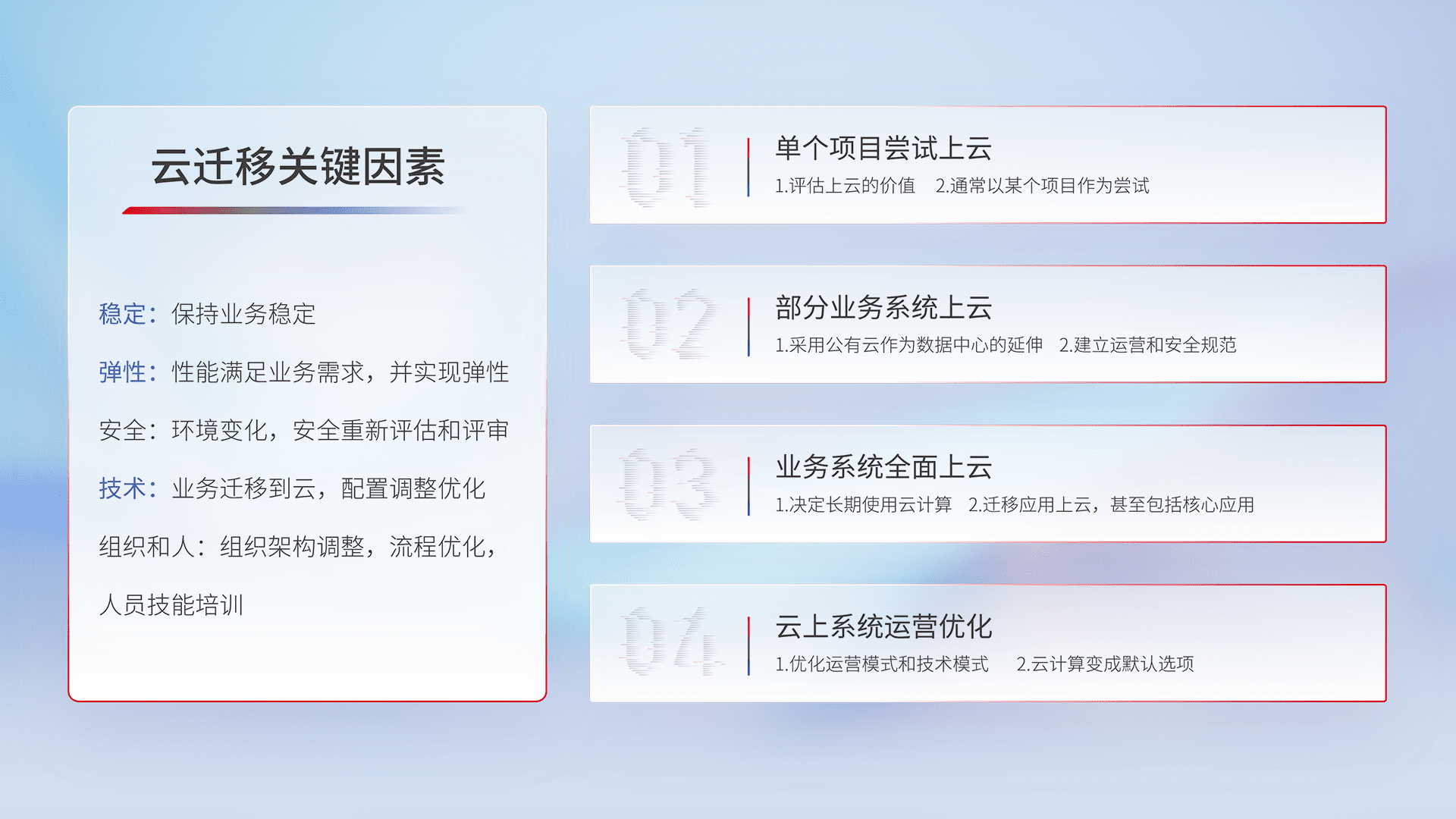 结合实际业务,,从规划设计、、、云平台选型、、、云原生改造、、、数据迁移、、、集成交付,,迁移全过程为客户识别最佳上云路径,,做好风险识别管理,,设计网络架构、、身份权限、、、、安全审计合规、、、操作审计、、、日志审计、、、、监控告警策略、、多站点容灾设计等,,,对云上基础设施进行整体规划,,提升IT治理水平,,,以满足弹性、、高可用、、高性能的需求。。。